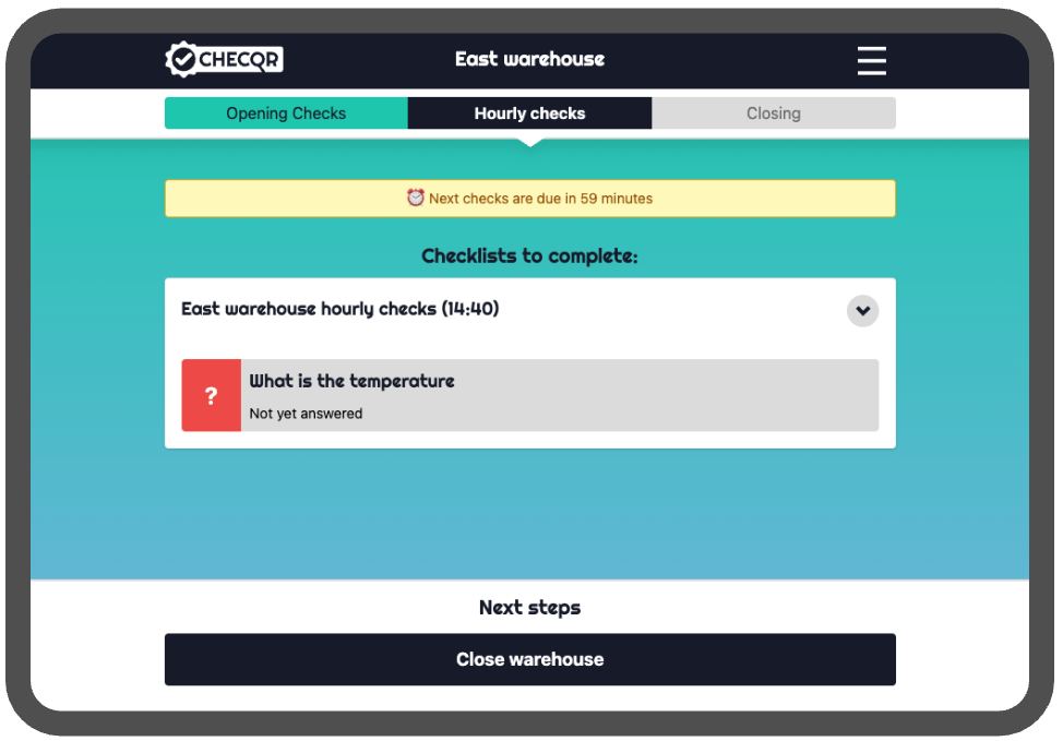 Above we can see what would be on the screen of a tablet after scanning the process QR code for an example ‘East warehouse’. We can see that the opening checks were carried out and we are now in the ‘hourly checks’ stage of the process. There is just one question to ask in the hourly checklist here, ‘what is the temperature’ and we can see from the note at the top of the screen that once answered the next check will be due in 59 minutes.