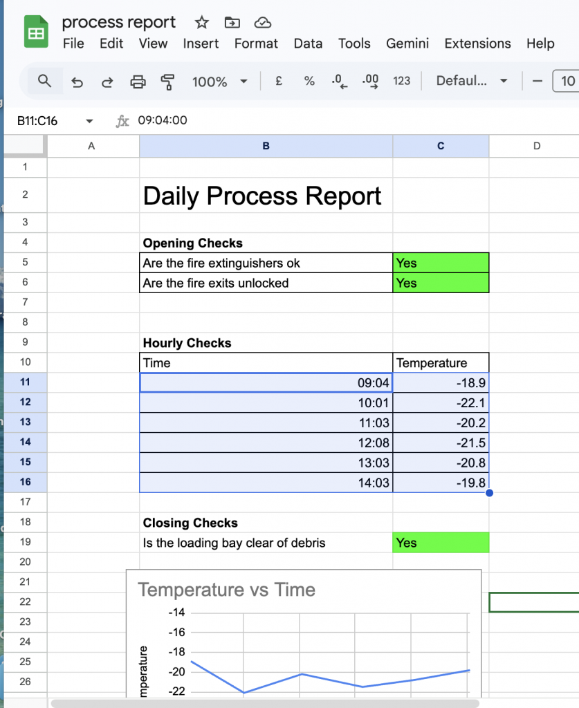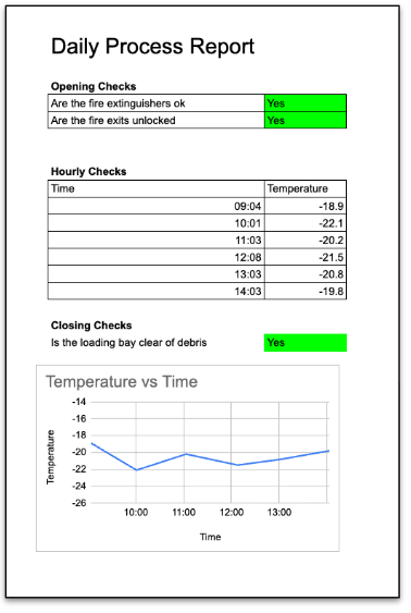 A daily report has been set up which includes answers from all of the checklists in the processes. The opening and closing checklists have a block to themselves at the top and bottom of the page respectively and the hourly checklists each have just one line in a table of hourly temperature checks. Because the report is produced from a template spreadsheet it is easy to include graphs, conditional formatting and so on. A graph of the recorded temperatures has been included in this case.