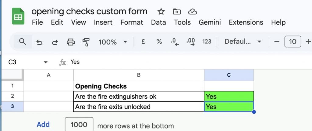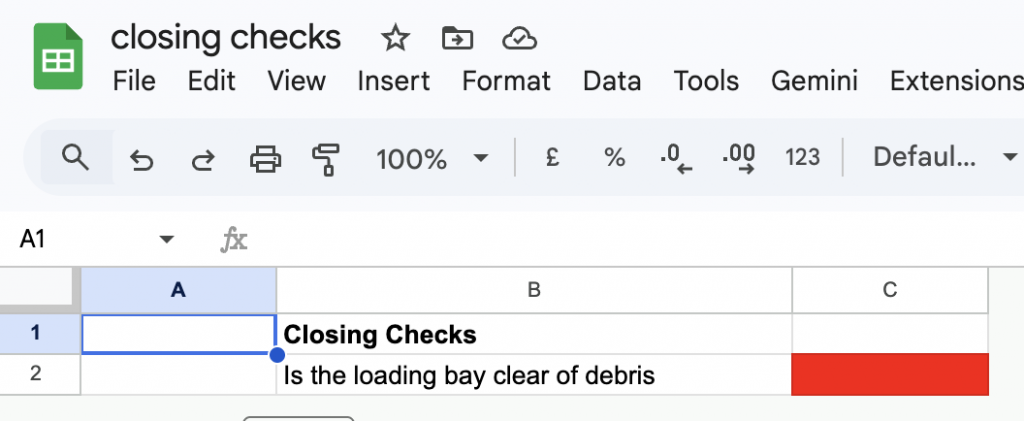 The closing checks has conditional formatting enabled and no value in the cell so it is showing as red, but will change to green when data is added. Data values in ‘answer’ cells will be overwritten when the report is made so it is safe to leave placeholders in, although it may be wise to make it obvious they are placeholders so you can be confident real data has been inserted correctly into the form when you are testing.