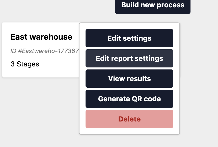 To find the processes section click the ChecQR logo to go to the home page for your organisation and then click ‘manage processes’ at the bottom right hand side of the screen. Then click ‘build new process’ to begin.