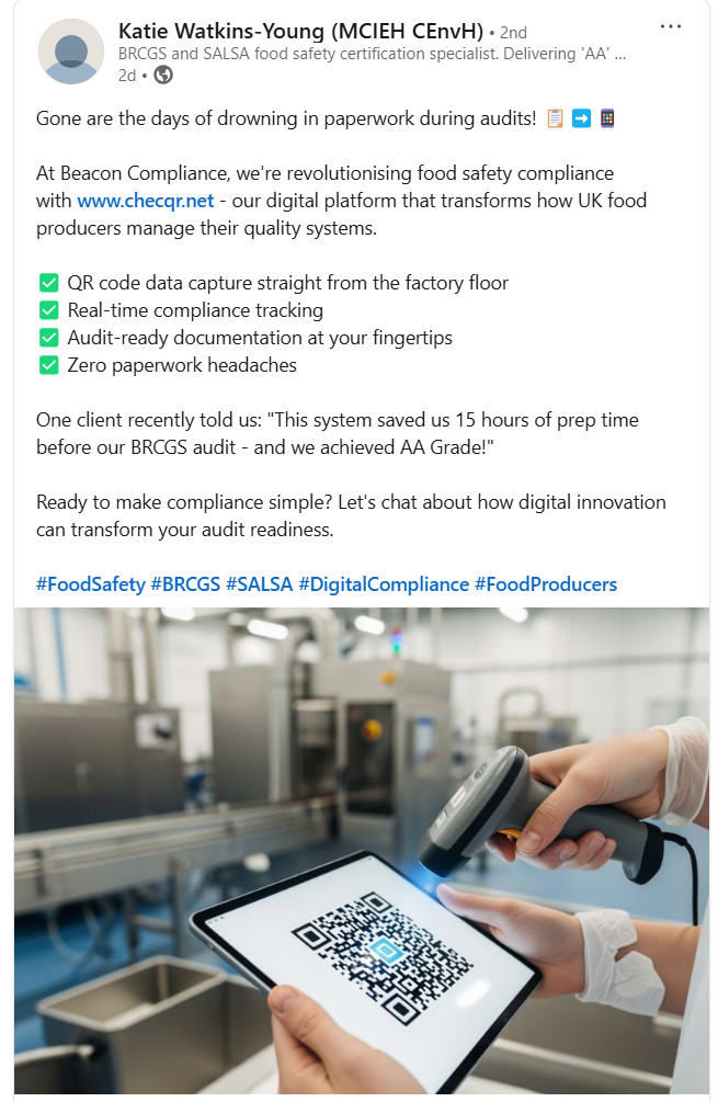 When Beacon Compliance recently shared how they use ChecQR, it reinforced what we hear from consultants across food production, manufacturing, and wholesale: clients aren’t just asking for advice anymore. They expect visibility, proof, and systems that will stand up under scrutiny. As a consultant, your expertise will always be the differentiator. But your ability to scale that expertise, to make it consistently visible and credible to clients and auditors, depends on the tools you put in place.